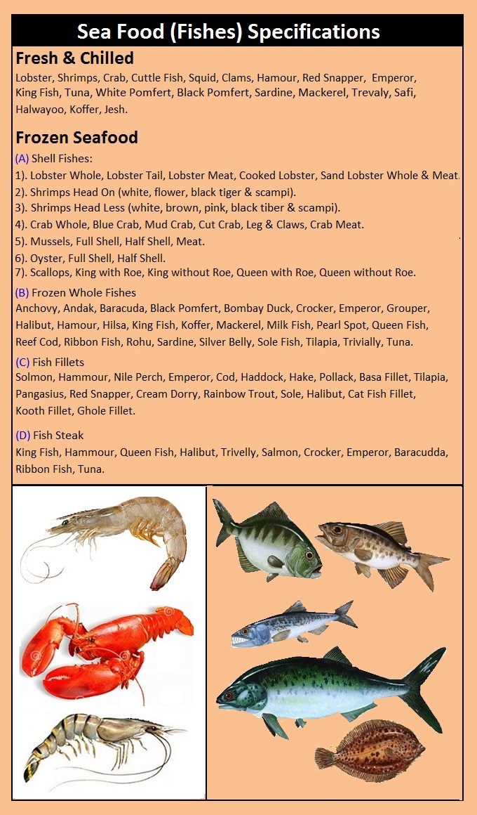 | Fresh & frozen fishes available like shell fishes, whole fishes, fillets & steaks etc. | |